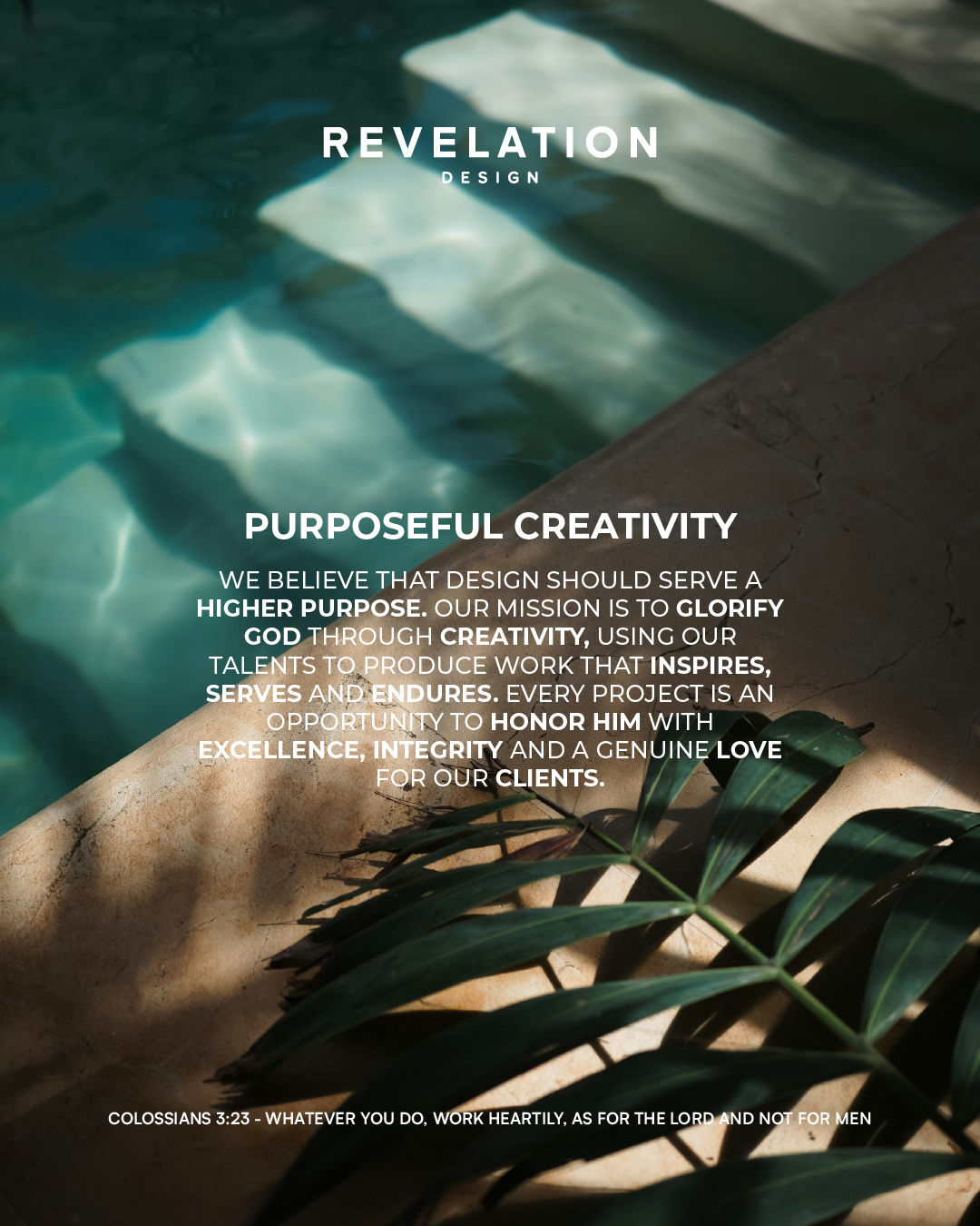 Our mission is to glorify God through creativity, crafting designs that inspire, serve and endure. We believe that every project is an opportunity to honor Him by working with excellence, integrity and love for our clients. Every design we produce is entrusted to Him, knowing that true success flows from His hand, not from chasing worldly trends.